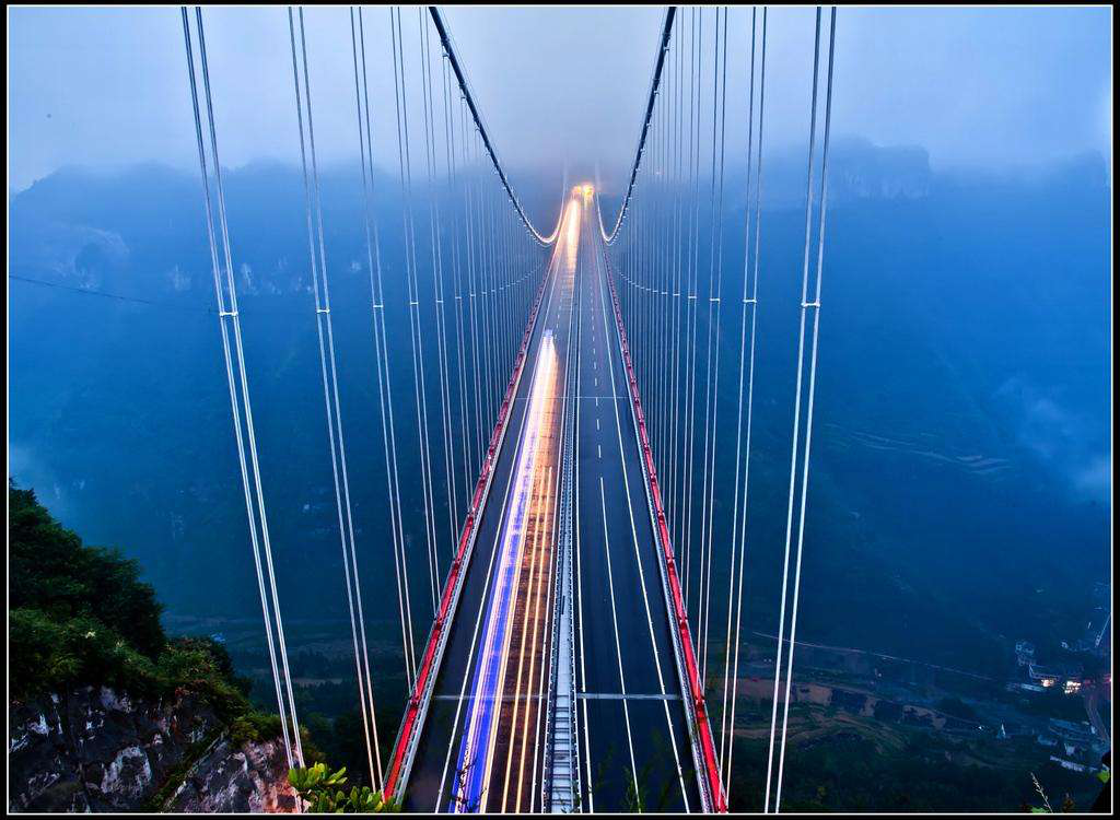 兩座高聳的山峰之間,湖南吉首矮寨特大懸索橋像一道彩虹,掛在大峽谷上,與下面的盤山公路遙相輝映。霧中有橋,橋中有霧,雄壯不失嫵媚。