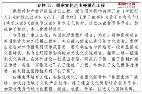 (三)創(chuàng)新儒家文化走出去模式。利用我國(guó)與世界各國(guó)文化合作交流機(jī)制框架,服務(wù)“一帶一路”戰(zhàn)略實(shí)施,發(fā)揮好文化年、旅游年、青少年交流年等平臺(tái)作用,注重培育市場(chǎng)化、民間化、專業(yè)化的傳播主體,促進(jìn)民心相通,向世界主動(dòng)傳播中國(guó)的價(jià)值理念與文化精髓。文化年,綜合運(yùn)用出境綜藝表演、文博展覽、民俗廟會(huì)、圖書(shū)展銷、廣播影視等多種形式和渠道,采取外國(guó)受眾易懂、易記、易學(xué)、易接受的方式和語(yǔ)言,形成全方位、多層次、寬領(lǐng)域、多渠道的交流新格局。旅游年,互相開(kāi)發(fā)更多個(gè)性化、定制化的深度游產(chǎn)品,支持中華醫(yī)藥、中華烹飪、中華武術(shù)、中華典籍、中國(guó)文物、中國(guó)園林、中國(guó)節(jié)日等中華傳統(tǒng)文化代表性項(xiàng)目走出去,在潤(rùn)物無(wú)聲中闡釋好中國(guó)特色。青少年交流年,促進(jìn)友好交流、務(wù)實(shí)合作,為外國(guó)青少年了解感知儒家文化搭建更多平臺(tái)、開(kāi)辟更廣渠道,織密心靈和情感的紐帶,為國(guó)家關(guān)系的未來(lái)發(fā)展打下牢固基礎(chǔ)。鞏固山東與友好省州、城市合作關(guān)系,不斷擴(kuò)大交流領(lǐng)域,重視民間力量、發(fā)掘民間智慧,在儒家文化交流方面取得更加豐碩的成果。加快鄒魯文化城市聯(lián)盟建設(shè),吸納更多海內(nèi)外城市加入聯(lián)盟,開(kāi)展鄒魯禮樂(lè)世界巡回展演,不斷提高鄒魯文化城市聯(lián)盟輻射力、影響力,推動(dòng)鄒魯文化城市品牌走向世界。