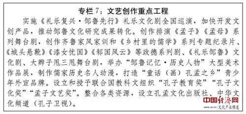 (四)打造儒藝創(chuàng)意文化產(chǎn)業(yè)基地。以曲阜新區(qū)國(guó)家級(jí)文化產(chǎn)業(yè)示范區(qū)和孟子湖新區(qū)為重點(diǎn),突出創(chuàng)意文化環(huán)節(jié)的開(kāi)發(fā)和拓展,推動(dòng)創(chuàng)意文化產(chǎn)業(yè)與其他產(chǎn)業(yè)的相互滲透和融合發(fā)展,建設(shè)具有儒家特色的創(chuàng)意文化產(chǎn)業(yè)集群。依托文化文物單位館藏文化資源,充分采用數(shù)字化、信息化技術(shù),研發(fā)推出工藝精良、制作精美的文物創(chuàng)意產(chǎn)品、旅游紀(jì)念品和衍生創(chuàng)意產(chǎn)品,促進(jìn)文化創(chuàng)意產(chǎn)品創(chuàng)新發(fā)展。大力發(fā)展以儒家文化品牌為主導(dǎo)的動(dòng)漫產(chǎn)業(yè),積極加強(qiáng)基于虛擬現(xiàn)實(shí)技術(shù)的原創(chuàng)動(dòng)漫游戲產(chǎn)品創(chuàng)作,構(gòu)建高端動(dòng)漫、網(wǎng)絡(luò)游戲產(chǎn)業(yè)發(fā)展體系。積極推動(dòng)與儒家文化品牌動(dòng)漫有關(guān)的圖書(shū)、報(bào)刊、音像制品的發(fā)行出版,引導(dǎo)企業(yè)開(kāi)發(fā)生產(chǎn)衍生產(chǎn)品。積極采用全景環(huán)繞、虛擬現(xiàn)實(shí)等技術(shù),創(chuàng)作一批影視精品、舞臺(tái)劇、音樂(lè)劇,打造高品質(zhì)旅游實(shí)景演藝產(chǎn)品,再現(xiàn)孔孟形象,反映儒學(xué)思想對(duì)人類文明的貢獻(xiàn)、春秋戰(zhàn)國(guó)時(shí)代的社會(huì)變革;積極加強(qiáng)與中央和省市各級(jí)電視臺(tái)、影視制作單位和網(wǎng)絡(luò)媒體的戰(zhàn)略合作,爭(zhēng)取建設(shè)影視基地。