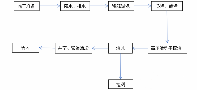 高壓水車把分段的兩檢查井向井室內(nèi)灌水,使用疏通器攪拌檢查井和污水管道內(nèi)的污泥,使淤泥稀釋;人工要配合機(jī)械不斷地?cái)噭?dòng)淤泥直至淤泥稀釋到水中。