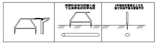 5、管線的對地泄漏電流可由“A”字架兩腳分別接收,而接收機(jī)顯示的信號大小則是兩針接收信號的差值,當(dāng)兩針接收的差值為零時(shí),則說明“A”字架在故障點(diǎn)的正上方