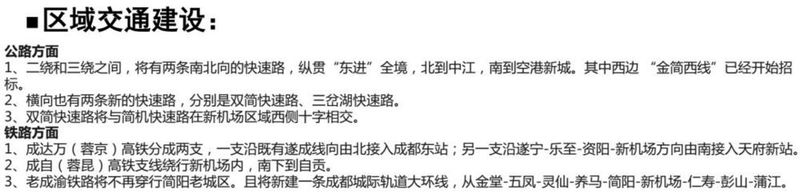 依托成巴高速、成南高速、天府國際機(jī)場高速等“六射一環(huán)”高速公路輻射區(qū)域,帶動(dòng)區(qū)域協(xié)同發(fā)展。建設(shè)金簡仁快速、中金簡快速、成資快速等多條區(qū)域快速通道,帶動(dòng)沿線城鄉(xiāng)發(fā)展。