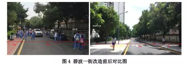 ● 碧波一街:原雙向車道機(jī)動(dòng)車道寬度從米壓縮為米,利用兩側(cè)消極的綠化帶,將兩側(cè)人行道寬度從米加寬到米。