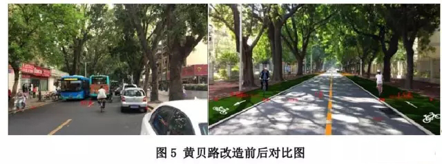● 黃貝路:原10 米機(jī)動(dòng)車道壓縮為米,在兩側(cè)各設(shè)置1.5 米寬自行車道,解決自行車出行和地鐵接駁需要。