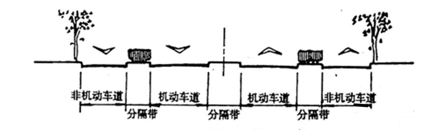 以三條分隔帶使對(duì)向車流分行、機(jī)動(dòng)車與非機(jī)動(dòng)車車種分流的橫斷面形式。