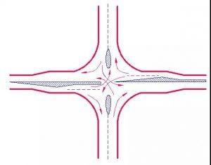 若無左轉彎車輛,四路交叉的沖突點由原來的16個減至4個。