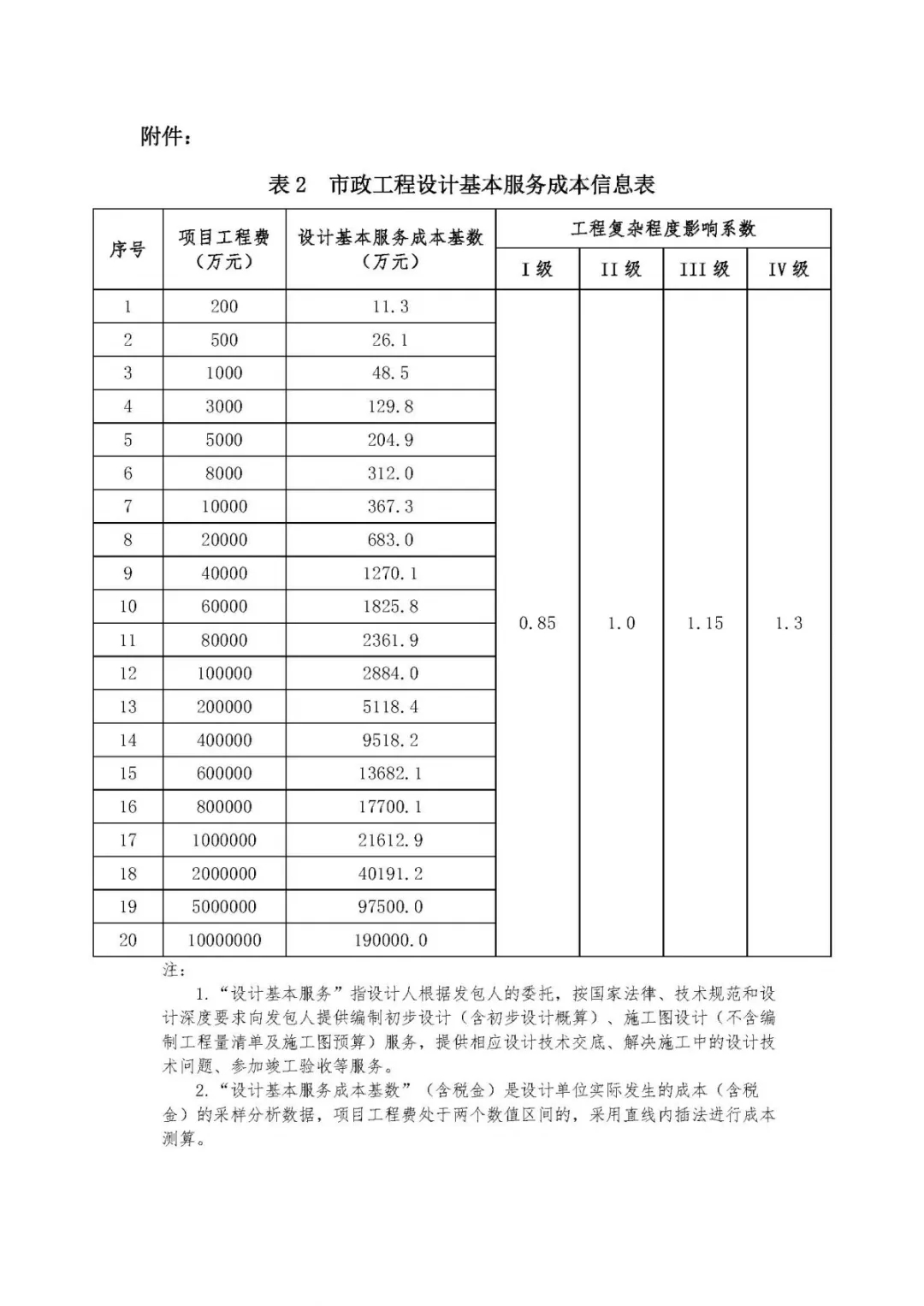 表2、市政工程設計基本服務成本信息表