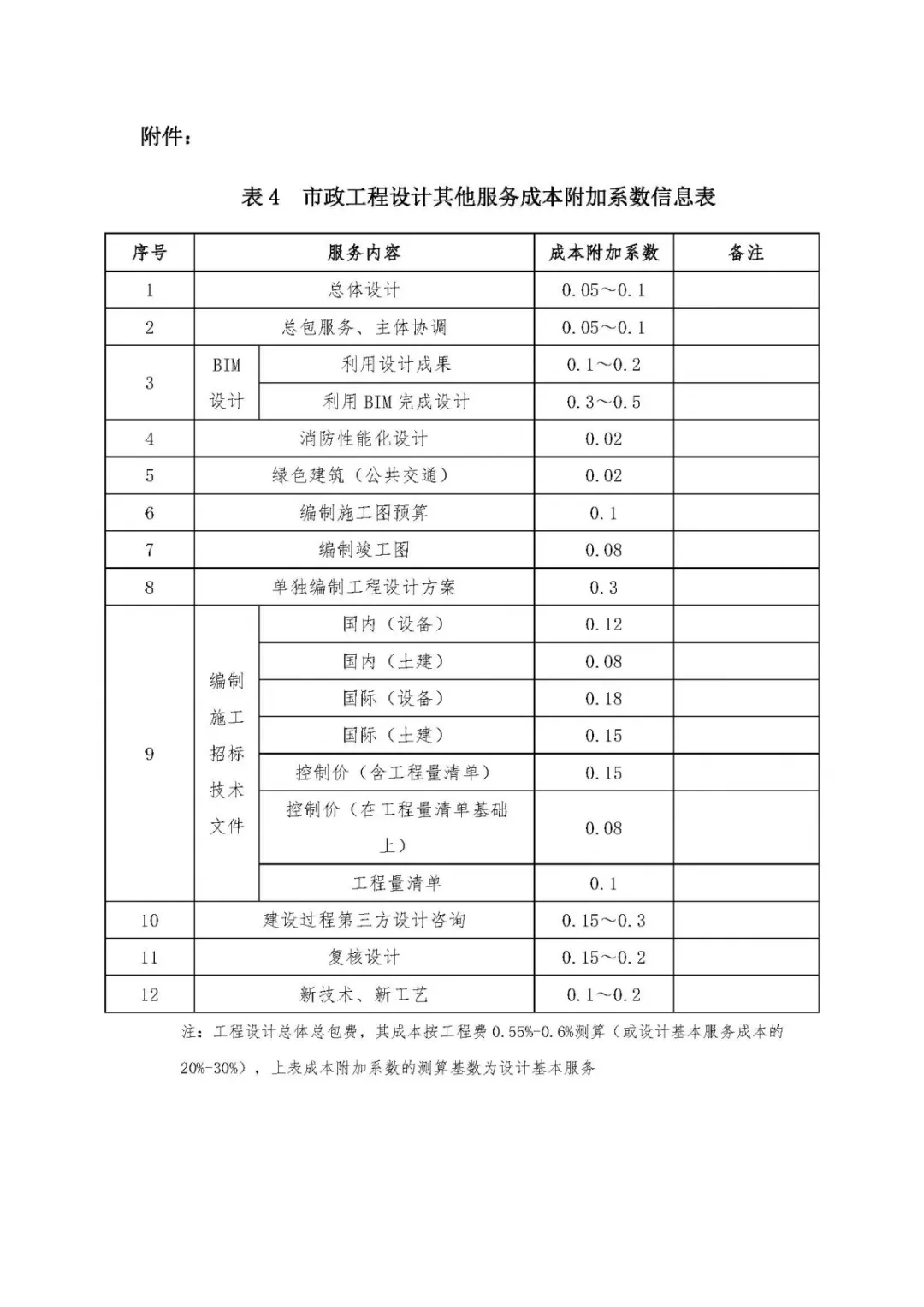 表4、市政工程設計其他服務成本附加系數信息表