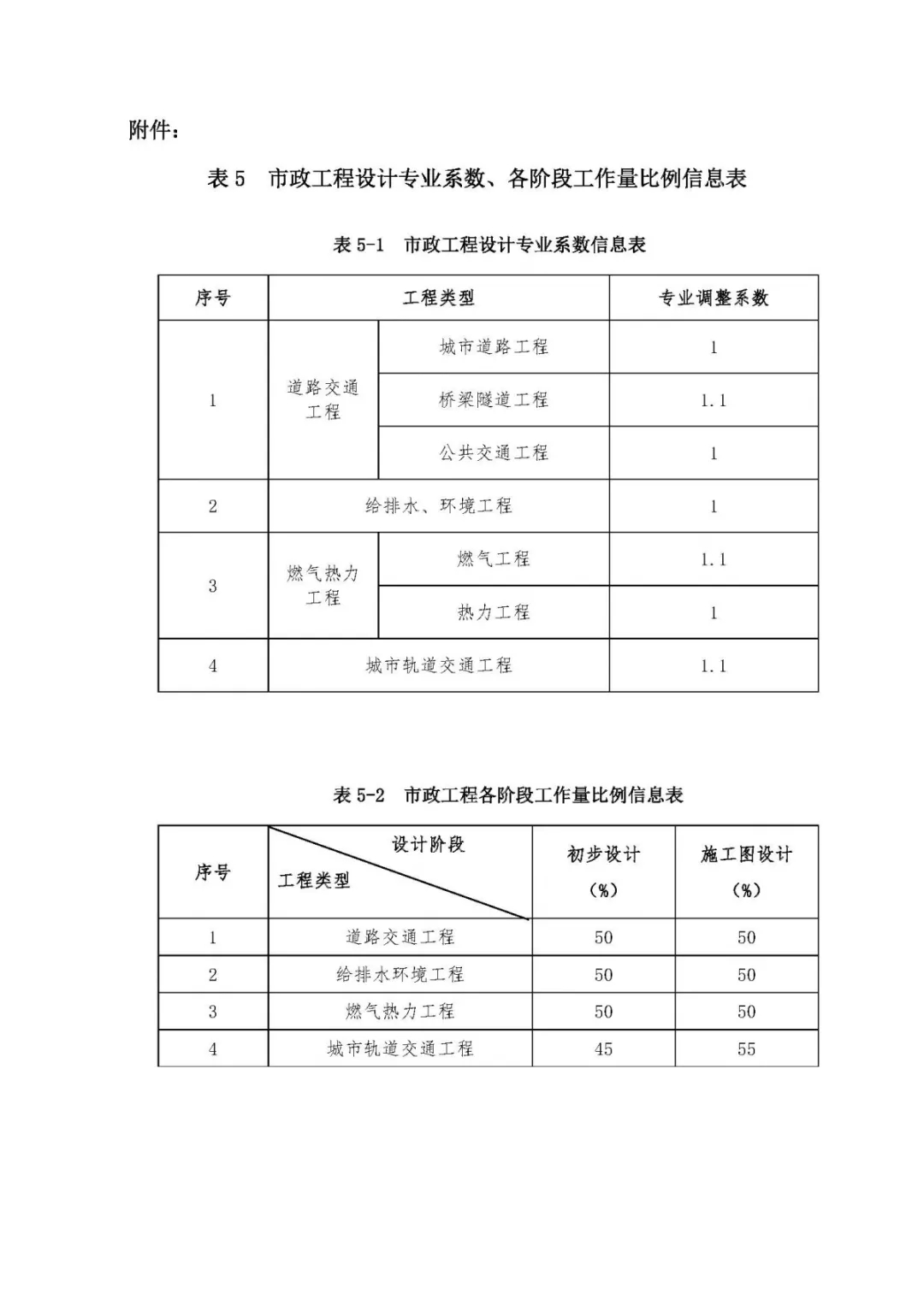 表5、市政工程設計專業系數、各階段工作量比例信息表