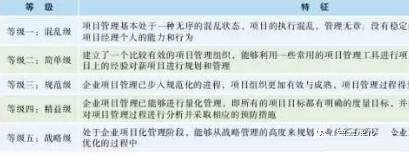 設(shè)計院向工程公司轉(zhuǎn)型升級,需要提升管理能力,如項目管理能力、商務(wù)和法律能力、專業(yè)采購和分包管理能力、信息化建設(shè)和運用能力等,這都是擺在傳統(tǒng)設(shè)計院面前的新課題。特別是項目管理能力的打造,是能否實現(xiàn)轉(zhuǎn)型的關(guān)鍵,只有真正具備了較為完善的項目管理能力,企業(yè)才能以工程公司模式順暢運作。根據(jù)項目管理理論,企業(yè)的項目管理能力可分為5個等級,見表1。