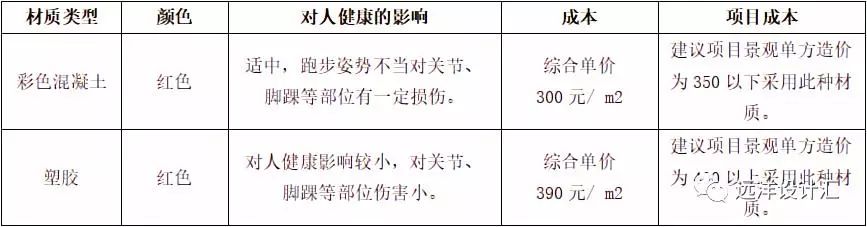 根據鋪裝材質、顏色對人健康的影響,綜合項目成本控制,居住區慢跑步道鋪裝材質選擇見下表3-1: