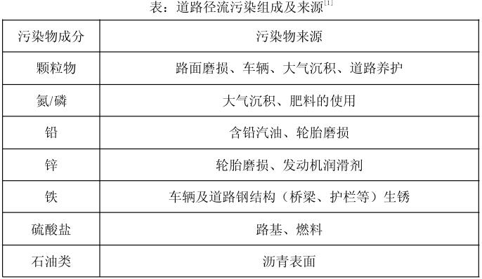 研究表明,道路徑流中污染物成分主要包括來源輪胎磨損、防凍劑使用、機械潤滑的泄漏、殺蟲劑及肥料的使用、廢物丟棄的顆粒沉積物、橡膠、金屬、油類等(見下表)。隨著城市道路和交通流量的飛速增長,路面污染物的累積量,不可避免的增加,并隨著道路雨水徑流進入周邊水體或直接滲入地下,對我國城市水安全造成極大的威脅。