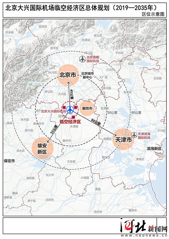 《北京大興國際機場臨空經濟區總體規劃(2019—2035年)》區位示意圖。