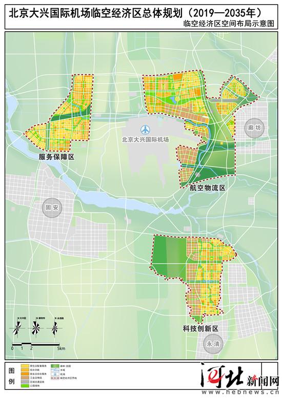 大興機場臨空經濟區總面積約150平方公里,其中北京部分約50平方公里,河北部分約100平方公里,包括服務保障區、航空物流區和科技創新區共3個功能片區。航空物流區重點承載航空物流、電子商務、綜合保稅、國際會展、航企服務等功能;科技創新區重點承載航空導向的研發創新、科技孵化、高端制造、科技金融等功能;服務保障區重點承載航空科教、特色金融、休閑娛樂、科技創新服務等功能。