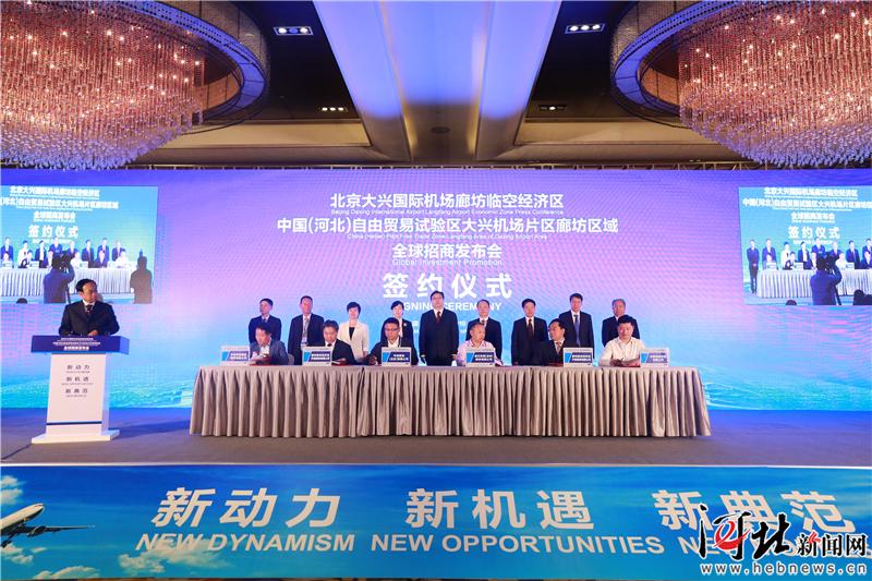10月10日,北京大興國際機場廊坊臨空經濟區·中國(河北)自由貿易試驗區大興機場片區廊坊區域全球系列招商發布會在石家莊市舉行。圖為簽約儀式。 通訊員陳童攝