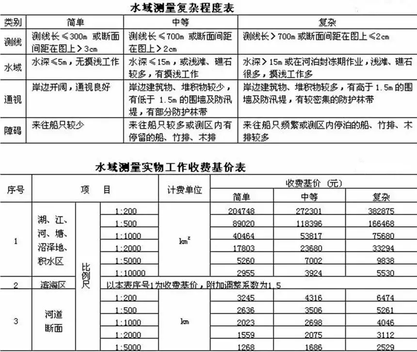 好了,不談這些題外的,先說說《工程勘察收費標準》的體系構成。與測繪局《測繪收費標準》相同的是也有該標準也有海區困難類別,水下地形測量依據水域復雜程度收費,分簡單、中等和復雜三個部分,對應Ⅰ、Ⅱ、Ⅲ類。不同的是《工程勘察收費標準》里沒有那些工資、材料費、運輸費、定額工日、班組定員等說明,因為海洋測量本來就是市場行為,你的人員工資等就應該體現在綜合報價中。另外,對一個水深測量項目應該去幾個人完成這樣的事,就沒有必要做出硬性規定吧,只要順利、按質完成項目要求即可。現在都什么年代了,有些水下地形測量項目都采用無人艇作業了,那么你還規定需要幾個人才能完成,是不是有些OUT了?