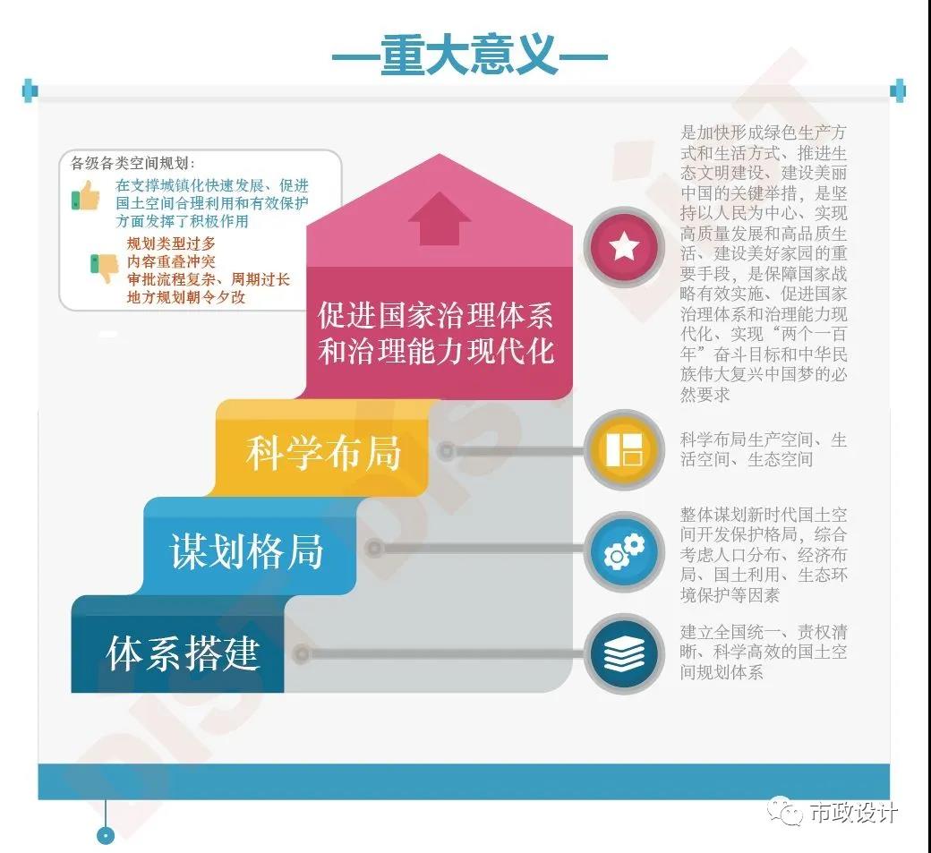 但隨著機構改革,2018年3月自然資源部正式掛牌成立,住建部規劃事權易主,空間規劃一統天下??臻g規劃改革的目的是為了構建以生態文明為導向、高質量發展的空間治理模式。對促進國家治理體系和治理能力現代化、科學布局、謀劃格局和體系搭建都具有重大意義,同時也強化了國土空間規劃對各專項規劃的指導約束作用。
