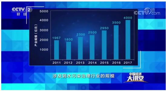 這張圖顯示出在2015年以后涉及到水污染治理行業的規模逐漸地增加,2014年時是2500億元,2015年則變成2950億元,2017年達到4000億。從2500億元到4000億元是跨越式的發展,按照現在的估計如果完成“水十條”的話會帶動社會投資4.7萬億元,而能夠帶動環保產業增長是1.9萬億元,這個數字表明環境治理它不是一個僅花錢不掙錢的事情,它還能帶動社會經濟快速和高質量發展。