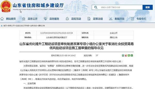 據(jù)山東省住房和城鄉(xiāng)建設(shè)廳網(wǎng)站,近日,山東省優(yōu)化提升工程建設(shè)項目審批制度改革專項小組辦公室發(fā)布《關(guān)于取消社會投資簡易低風險建設(shè)項目施工圖審查的指導意見》,內(nèi)容如下。