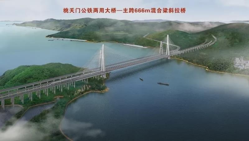 ,均為公鐵兩用,在同一平面布置了雙線鐵路及雙向六車道高速公路。其中,西堠門大橋采用斜拉懸索協(xié)作體系,主跨達(dá)1488米,建成后將是世界同類工程中跨度最大的公鐵合建橋梁;桃夭門大橋?yàn)榉蛛x式混合梁斜拉橋,主跨達(dá)666米。