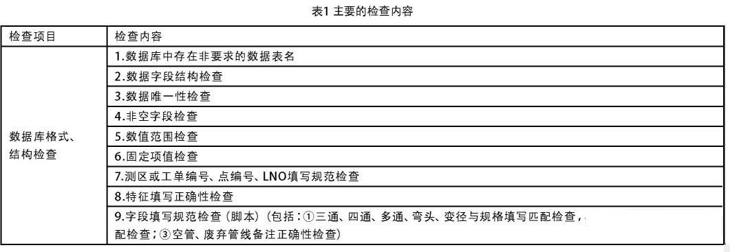 目前,全國各管線單位要求生產單位提交的數據集一般是Microsoft Office Access數據庫的mdb文件.數據庫格式、結構檢查主要檢查管線數據庫中的數據表是否齊全是否存在多余的表、表的字段名和數據類型是否正確、字段值的填寫格式是否符合規程的要求等.主要的檢查內容見表1: