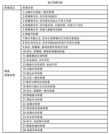 數據邏輯性檢查復雜多樣,主要包括: 屬性值的邏輯一致性檢查, 管線、管點要素邏輯結構的合理性、正確性等.例如,在管線點數據表和管線段數據表中管線點編號相同的點,其坐標必須相同;如果附屬物為井,井深可定不能為0或空;個別管線段出現倒流的現象.主要的檢查內容見表2: