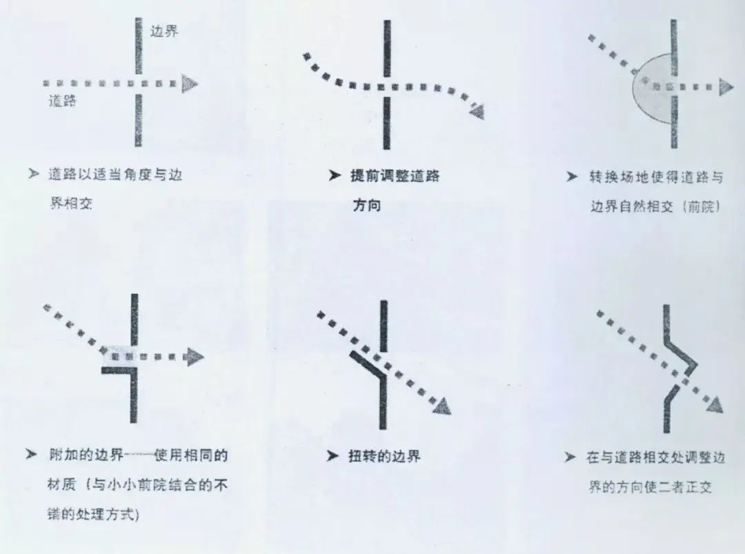 道路與邊界應讀以適當的角度相交。如果道路需要旋轉一定方向與邊界相交,可以提前做適當的處理。包括提前調整道路的角度,在邊界前留出一塊轉換空地或者使得邊界與道路的方向相呼應。
