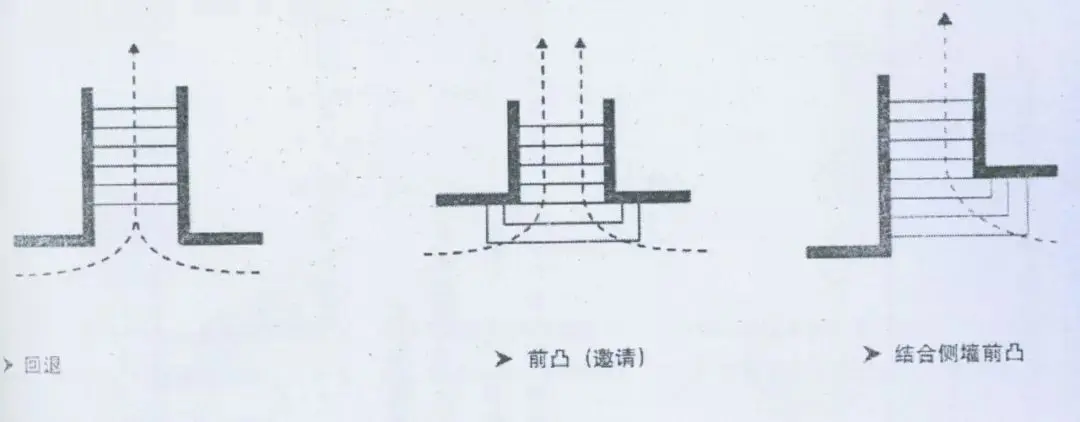 臺階以為著強烈的指向。在臺階上下的區域應當做特殊處理以表明方向的改變。因此,建筑邊沿的臺階應當向前延伸(公共性、邀請感)或者向后退縮(私密性、限制感),其他景觀看見宜同。