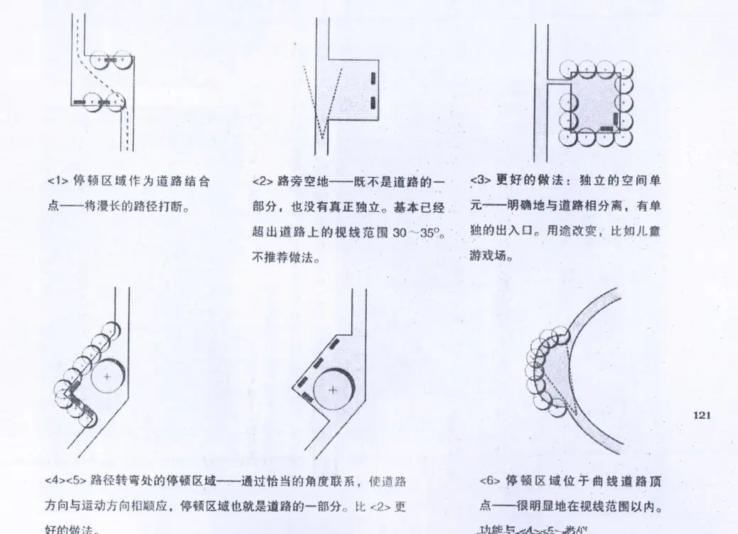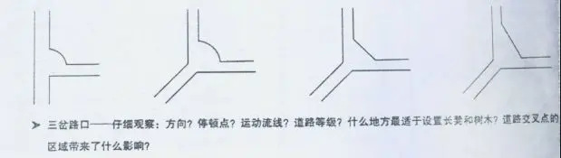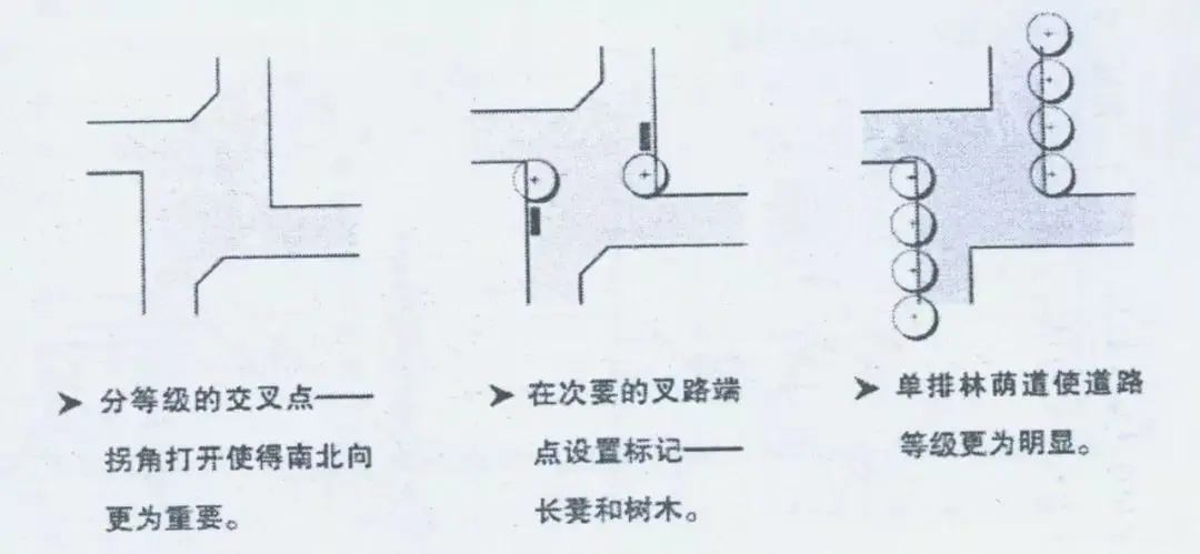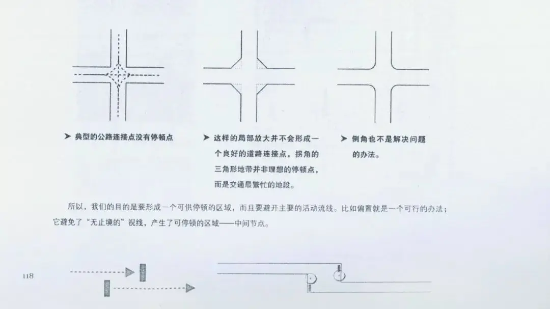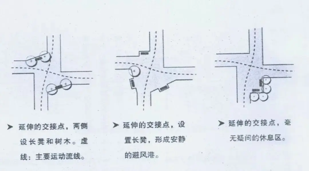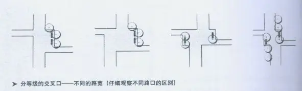 道路連接點與公路連接點不同,需要一些停頓區域。使用者在此稍作停頓,觀察選擇自己的運動方向。因此,連接點需要在交叉路口加寬,有足夠的空間。但是僅僅加寬道路并不會自動產生一個宜人的道路連接點。
