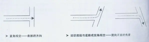 如果運動流線與線性構筑物(道路,空間邊界等)相交角不是自然的正交,運動流線就會自動導向開放的“鈍角”一側。