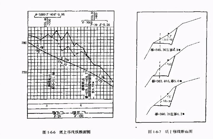 (7)根據橫斷面圖上移線的后中樁處的相對高差,在原縱斷面圖上點繪移線后地面線(用虛線表示).重新設計縱坡及堅曲線,如圖l-6-6所示。