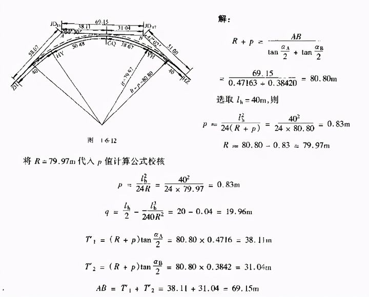 例1-6-2 如圖1-6-2,JD16為雙交點曲線。已知aA=50°30′,aB=42°02′,AB=69.15m.試求平曲線半徑。