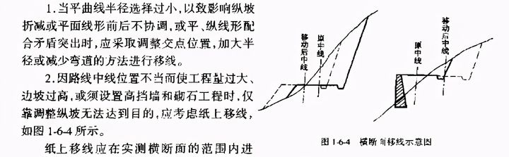 在公路定線過程中,往往由于定線時考慮不周、地形條件限制或其他原因,難免產生因平面中線位置不當致使工程量過大、標準或線形不夠理想等缺點。此時可在分析研究已定路線平、縱、橫圖紙資料的基礎上,考慮移動路線,使設計達到經濟合理的要求,它對提高設計質量,降低工程費用起著一定的作用。當路線設計出現以下情況時,應考慮紙上移線。