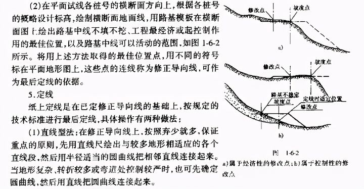 公路定線根據公路等級、要求和條件,一般有紙上定線、實地定線和航測定線三種方法;對技術等級高的、地形、地物復雜的路線,必須先紙上定線.然后把紙上所定的路線敷設到實地上;實地定線就是省略了紙上定線這一步,直接在現場實地定線,一般適用于公路等級較低和地形等條件簡單的路線;航測定線是利用骯攝像片、影像地圖等骯測資料,借助干航測儀器建立與實地完全相似的立體光學模型,在模型上直接定線。