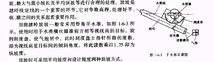 放坡一般從最高控制點(如埡口)開始,一人用帶角手水準,對好選用縱坡的相應傾斜角度,立于控制點處,指揮前點人員手持花桿在山嘴、山坳等地形變化處、計劃變坡處及順直山坡上每隔一定距離定點,插上坡度旗,并在旗上注明選用的縱坡值。按上述方法定出的這些坡度點的連線.與紙上定線的導向線作用相同,也稱導向線。放坡傳遞坡度時,耍估計平曲線的大概位置及半徑,以便考慮縱坡折減。對擬定要跨的山溝和要穿的山嘴或山脊放要“跳”過去,否則會使放出的坡度與設計縱坡誤差太大,苦難備對山溝或山嘴進行繞越,則坡度要放緩,距離要打一定的折扣。