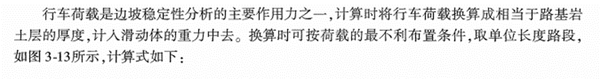 在《公路路基設計規范》(JTG D30-2015)中沒有發現對邊坡穩定計算時行車荷載如何考慮的條文,但是在《路基路面工程》(黃曉明版)和《公路軟土地基路堤設計與施工技術細則》(JTG/T D31-02-2013)中有相關表述。《公路軟土地基路堤設計與施工技術細則》4.1.4-4.1.6條的規定如下,即將行車荷載換算成土柱高度,可按車輛荷載均布于車輛投影面積上換算得出。
