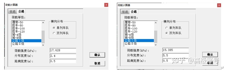 在實際設計工作中,對于高陡邊坡的驗算主要采用理正軟件。在理正邊坡穩定模塊中,對于超載這塊是可以去選擇的,內置了公路I級和公路II級車輛荷載,理正提供了單列車隊和雙列車隊兩種橫向分布形式,其默認值的計算過程可參考前面《路基路面工程》的公式。
