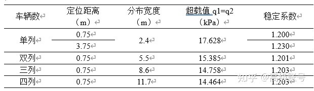 定位距離分成0.75m和3.75m兩類,假定土路肩寬度0.75m,硬路肩寬度3m,看車輛分布在硬路肩外邊緣和行車道外邊緣的區別。分布寬度和強度按照前述計算過程,從單列到四列,結果如下表。