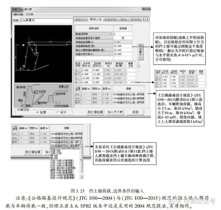 在實際設計工作中也常用理正軟件來進行設計或驗算。理正擋墻中內置了多種計算車輛荷載的方法,其中采用“2004路基規范擋土墻車輛車載”這一選擇,即是跟現行規范的規定一致,換算土柱高度是根據我們輸入的墻高和填土容重自動計算的。所以個人認為直接選這一項就可以了。