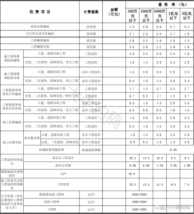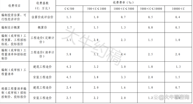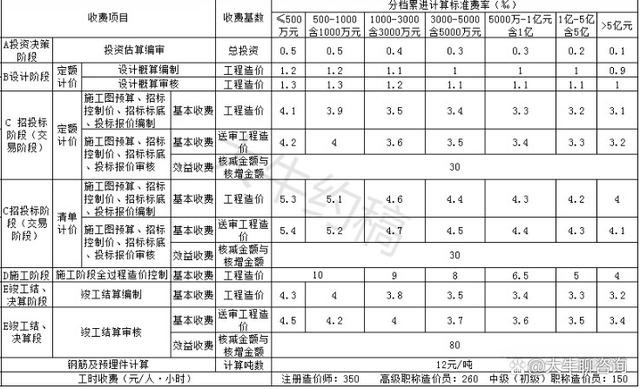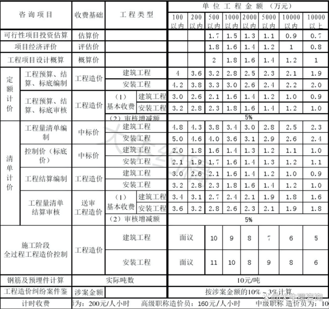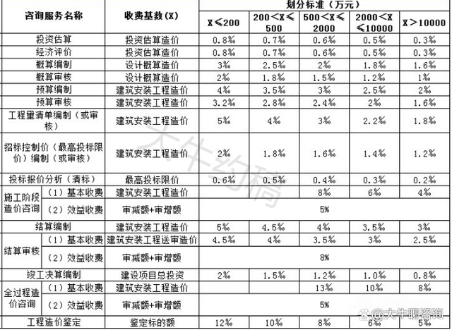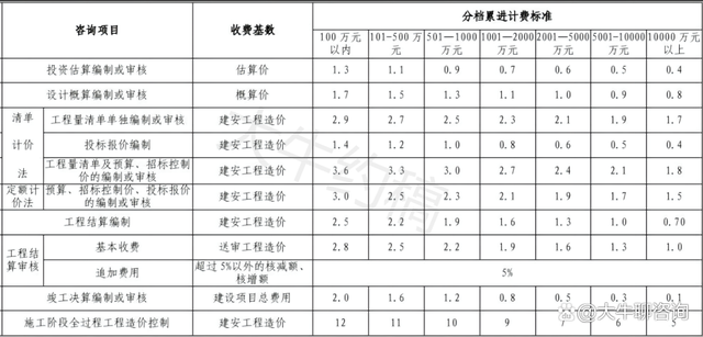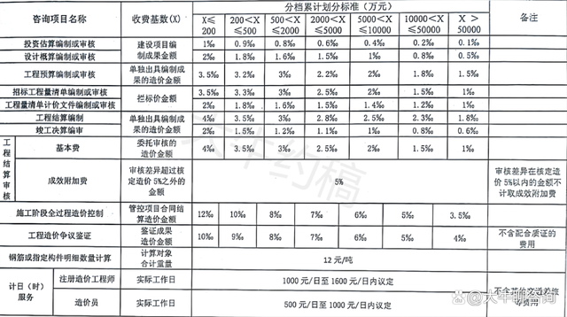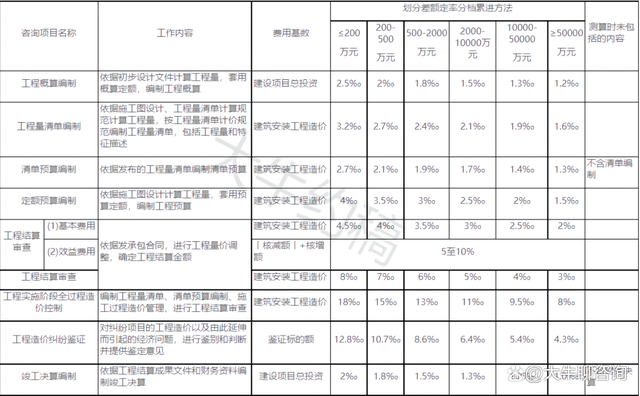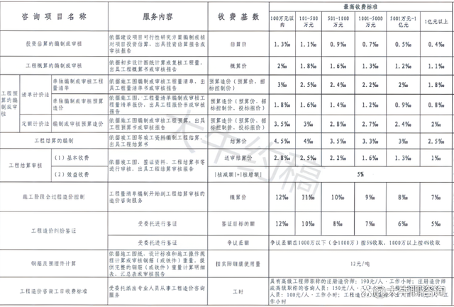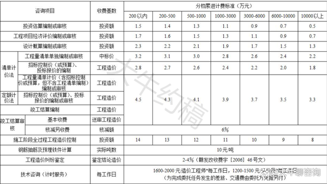 一、上表收費(fèi)按差額定率分檔累進(jìn)法計(jì)費(fèi)。劃分標(biāo)準(zhǔn)為單項(xiàng)工程。當(dāng)咨詢收費(fèi)不足2000元時(shí),按2000元收取;