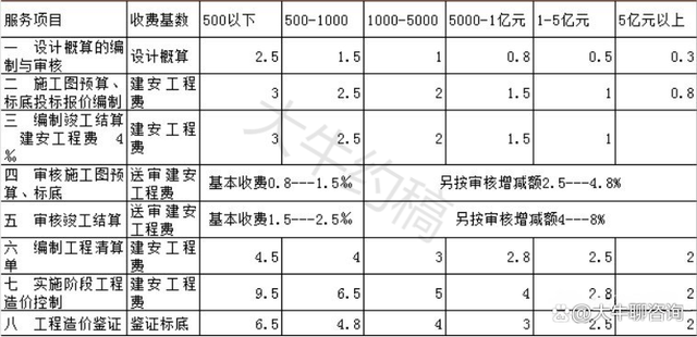 1.表中“工程預(yù)算、結(jié)算、決算審核、審計(jì)”項(xiàng)目的計(jì)費(fèi)方式為(1)+(2);