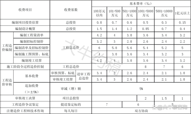 3、施工全過(guò)程工程造價(jià)控制咨詢服務(wù)的內(nèi)容包括:合同價(jià)、工程變更價(jià)款的審核,現(xiàn)場(chǎng)簽證審核,參與設(shè)備材料詢價(jià),進(jìn)度款支付和竣工結(jié)算審核等內(nèi)容,如超過(guò)以上工作內(nèi)容則另行計(jì)費(fèi);咨詢企業(yè)在開(kāi)展施工階段全過(guò)程工程造價(jià)控制咨詢工作中,如發(fā)生工程造價(jià)核減額,則可另按核減額6% 的比例增加咨詢服務(wù)收費(fèi);