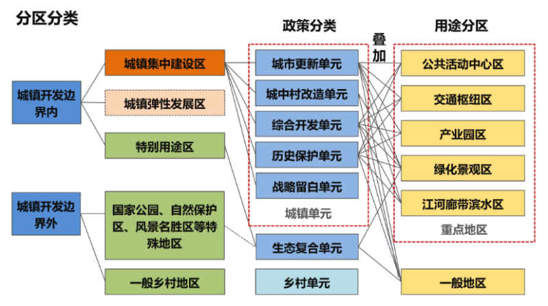 (一)搭建用途分區疊加分類政策多場景。立足國土空間全域全要素規劃管控要求,協調城鎮開發邊界內外關系,劃分一般用途區和重點用途區,其中重點區包括公共活動中心區、交通樞紐區和江河廊帶濱水區等。在用途分區基礎上,疊加各類政策,明確城市更新、城中村改造、綜合開發、歷史保護、生態復合和戰略留白等類型單元,進行分區分類指引,實現土地利用全生命周期、全利用方式的管控,保障相關政策得以落地。
