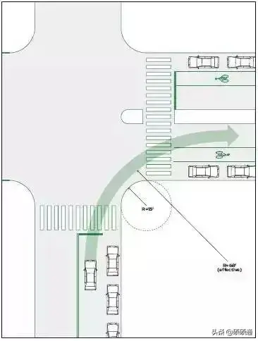 采用較大半徑且渠化拓寬的交叉口,長這個樣子: