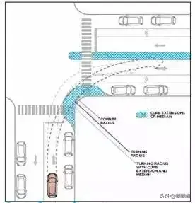 對小轉彎半徑的優勢也有明確的研究和定性:越小的轉彎半徑,對過街行人越有利。小轉彎半徑優勢明顯:①可以迫使機動車轉彎時降低車速減少事故;②有效縮小交叉口范圍,減小行人過街的距離;③增大步道在交叉口轉角空間的面積;④有利于交叉口處步道坡道的設置。