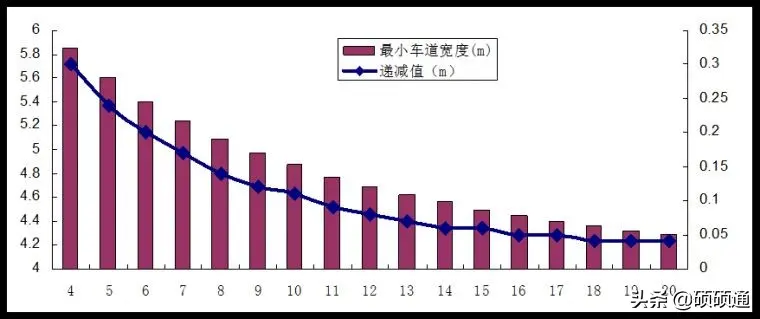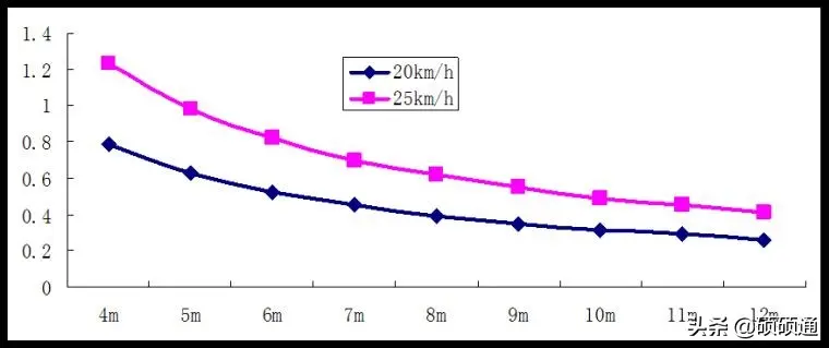 車輛轉彎有輪差,所以轉彎車道寬度要求一般稍大。以常規大巴公交車行駛為例,橫向側距取0.5米,則可以計算得出車道寬度和轉彎半徑的對應關系圖如下。