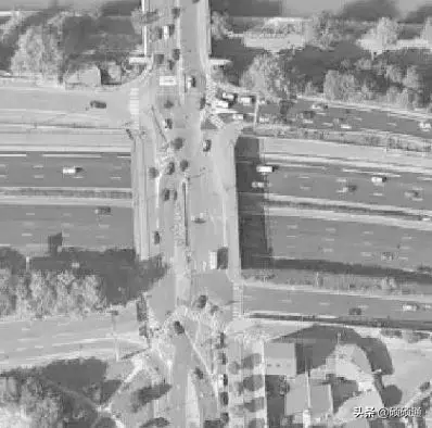 2000 年Jonathan Reid 提出一種新型交叉口設計方案,即扇形交叉口(Quadrant Roadway Intersection)。其設計思想是主交叉口禁止左轉,利用十字交叉口某象限內的連接通道組織車輛左轉,簡化主交叉口信號相位,從而提高交叉口運行效率,改善主交叉口的擁堵狀況。美國某城市的扇形交叉口實景圖: