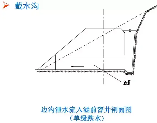 ③截水溝水流不應(yīng)引入邊溝,當(dāng)必須引入時,應(yīng)增大邊溝橫斷面,并進行保護;